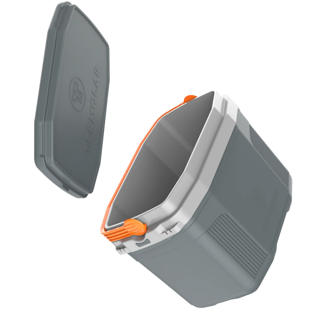 A Caixa Térmica Termolar SUV 20L vem equipada com uma alça reforçada, garantindo maior segurança no transporte individual. Sua ergonomia é otimizada graças às angulações nos cantos, permitindo um transporte confortável mesmo em dupla. A tampa foi projetada com pegas superiores e inferiores para facilitar a abertura com uma única mão. Na base, pegas adicionais auxiliam na retirada de líquidos ou gelo, aumentando a conveniência de uso.