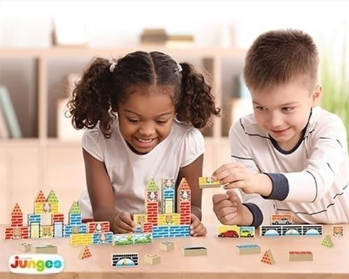 Construtor Junges é um brinquedo de construção. Elaborado a partir de bloquinhos em madeira de reflorestamento (MDF) em 15mm de espessura, é composto com peças de tamanhos e desenhos diferentes para montar a cidade que desejar. Acompanha cartela de adesivos coloridos para decoração dos bloquinhos. Além de ser uma alternativa ecológica, é um brinquedo excelente para a criança ampliar os horizontes da imaginação, desenvolver habilidades e a capacidade motora fina. Com as peças podem-se montar diversas configurações de cenário, dando à criança maior liberdade para se divertir, criar e brincar.