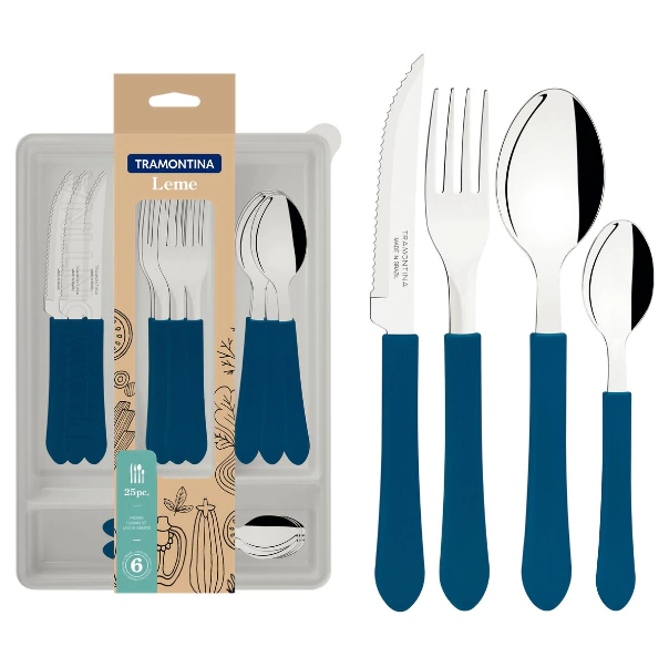 O faqueiro Tramontina Leme com lâminas em aço inox e cabos de polipropileno com gaveteiro 25 peças irá deixar suas refeições com muito mais sabor e sua mesa cheia de estilo. Os talheres que o compõem possuem lâminas produzidas em aço inox e cabos de polipropileno, atributos que proporcionam durabilidade e resistência. Devido a cor, ele deixa sua mesa muito mais agradável e encanta a todos na hora da refeição. As peças são também muito fáceis de limpar e podem ser lavadas na máquina de lavar louças. O faqueiro vem acompanhado de gaveteiro plástico, ideal para armazenar e guardar os talheres em sua gaveta. Um item perfeito para quem busca praticidade para o dia a dia!