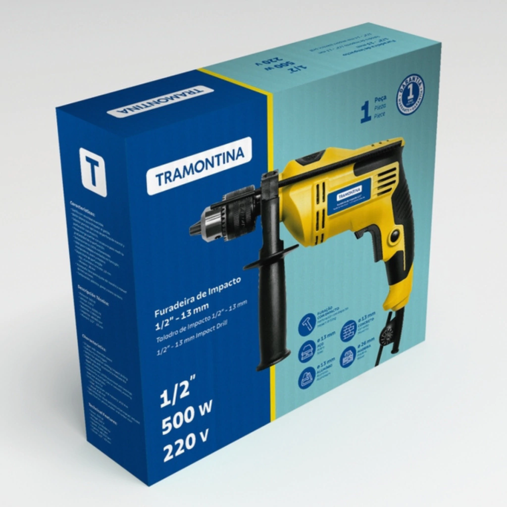 Equipamento indispensável para o seu kit de ferramentas, a Furadeira de Impacto Tramontina 500 W 220 V 1/2 Polegada com Empunhadura Auxiliar e Sistema de Reversão estará a postos para as instalações e reparos de sua casa! Projetada para perfurar madeira, metal e concreto, possui botão seletor de sentido de rotação, trava de gatilho e dois modos: com e sem impacto.