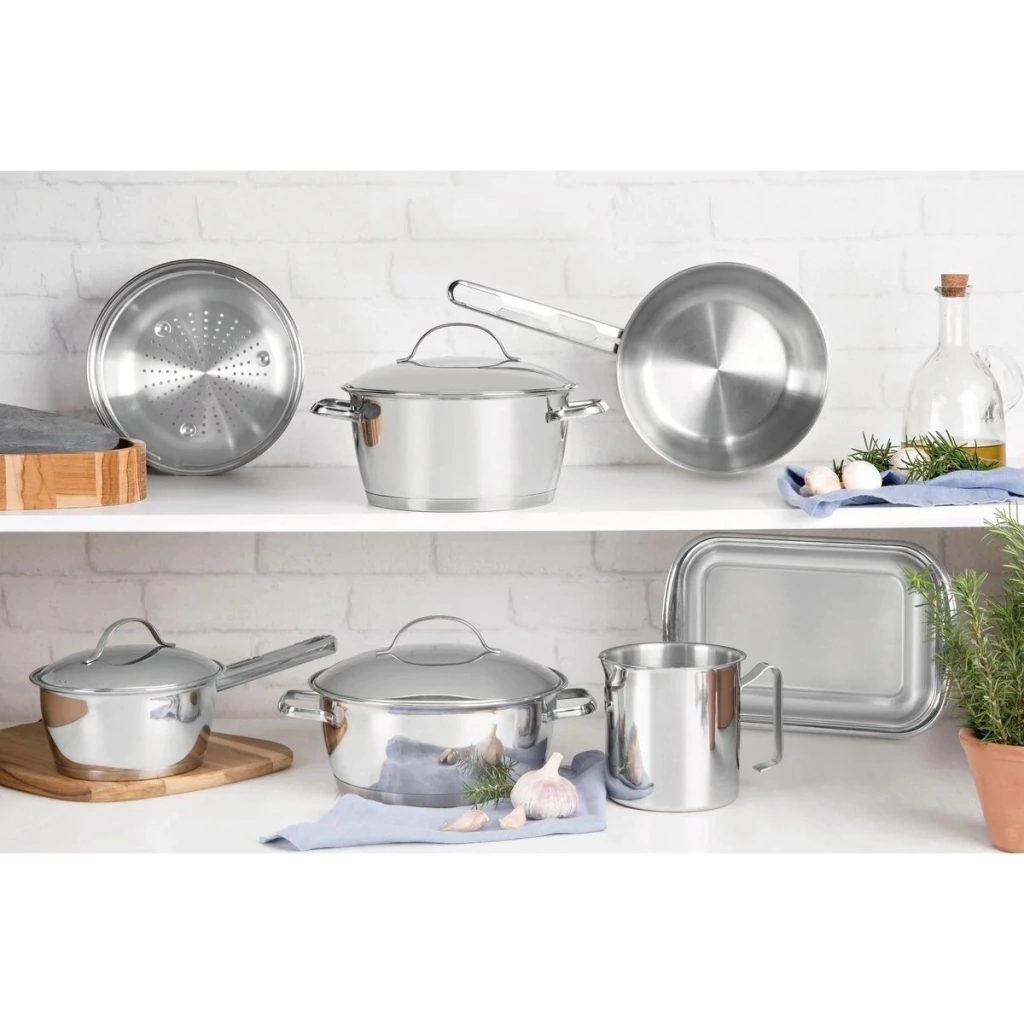 Sua cozinha ficará completa com o Jogo de Panelas Tramontina Allegra em Aço Inox com Fundo Triplo 7 Peças. São sete peças perfeitas para você preparar diferentes tipos de receitas, das mais simples às mais complexas. Elas apresentam fundo triplo (aço inox + alumínio + aço inox), tecnologia que distribui o calor uniformemente, cozinhando os alimentos mais rápido e economizando energia. Por isso, você pode manter o fogo baixo durante todo o preparo e, assim, poupar energia. Além disso, a panela toda em aço inox pode ir ao forno para gratinar ou finalizar pratos, na temperatura máxima de 260°C. São utensílios de muito bom gosto e totalmente produzidos em aço inox. Eles embelezam sua cozinha dando um toque de elegância e estilo. O design moderno também traz tampa com saída de vapor e encaixe perfeito, facilitando o uso. Ideal para as tarefas do dia-a-dia ou para aquela reunião com pessoas especiais. As peças ainda são muito versáteis, podendo ir ao forno e em diferentes tipos de fogões. Fácil de limpar: deixar sua panela brilhando é simples, você só precisa de água, sabão e uma esponja macia. Se preferir, é só colocar na máquina de lavar.